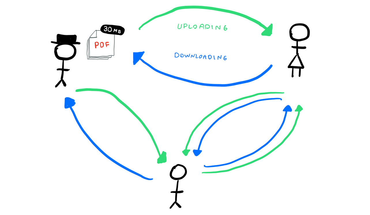 While a leecher is downloading pieces, they may upload those pieces they have already received to other peers in the swarm. Some users, as pictured below, can even upload and download from each other at the same time as they both have and require different pieces of the same file that can be shared between them.